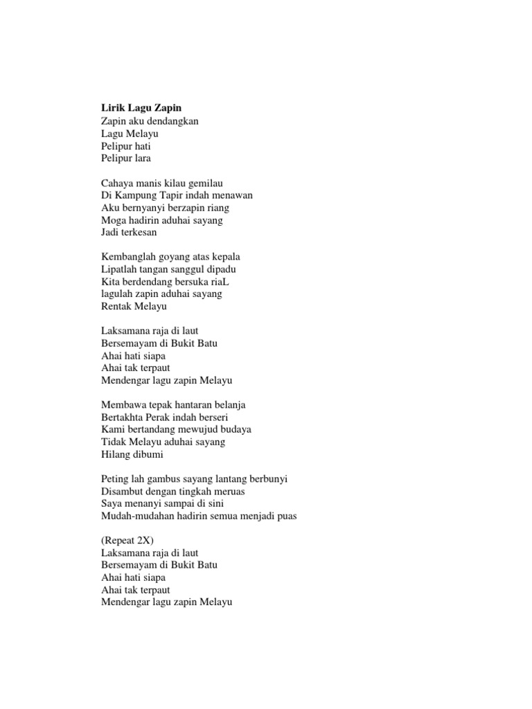 Peting lah gambus sayang lantang berbunyi disambut dengan tingkah meruas saya menanyi sampai di sini mudah mudahan hadirin semua menjadi puas repeat 2x laksamana raja di laut bersemayam di bukit batu ahai hati siapa ahai tak terpaut mendengar lagu zapin melayu.