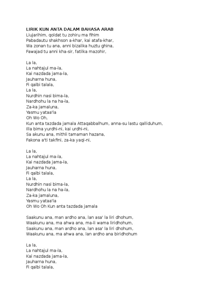 Doc Lirik Kun Anta Dalam Bahasa Arab Tuan Muda Academia Edu